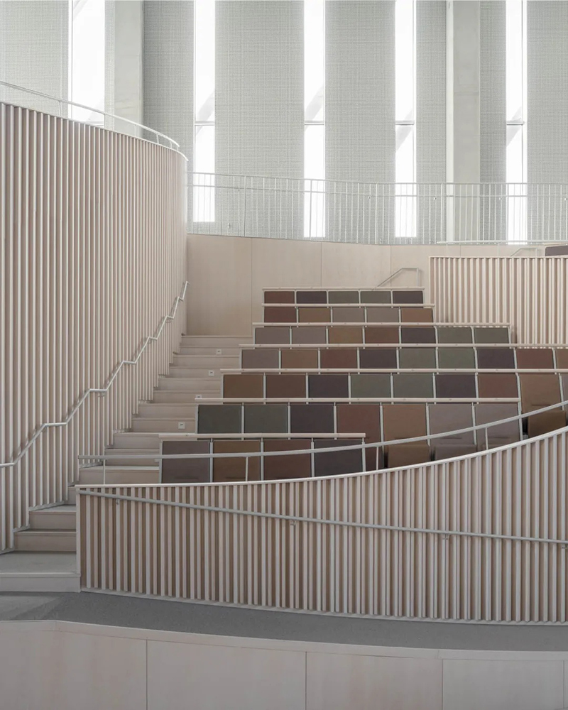 建筑外觀抽象的上立面及其對角線,從遠(yuǎn)處看,給人一種摩爾云紋的視覺效果——由覆蓋在建筑上層的斜向鋁條所創(chuàng)造。這些鋁條不僅具有裝飾功能,同時(shí)是對教堂圣經(jīng)象征符號“麥穗”的抽象詮釋。
