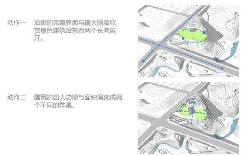 建筑分南北兩樓,地上建筑分為4個(gè)主要建筑功能:總部辦公區(qū)、交流培訓(xùn)區(qū)、展覽展示區(qū)、服務(wù)配套區(qū)。建筑的設(shè)計(jì)理念在融入山地自然資源的同時(shí),還結(jié)合了現(xiàn)代旅游形式。