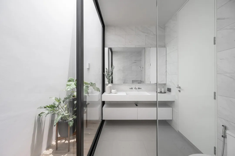 由于建筑地塊三面臨街,設(shè)計(jì)師需謹(jǐn)慎考量退縮限制,最終設(shè)計(jì)了一棟三層的住宅,包含庭院、車(chē)庫(kù)、 客廳和臥室,以及連接兩棟房子的廚房。這些設(shè)計(jì)既滿足了家庭需求,又充分利用了空間。